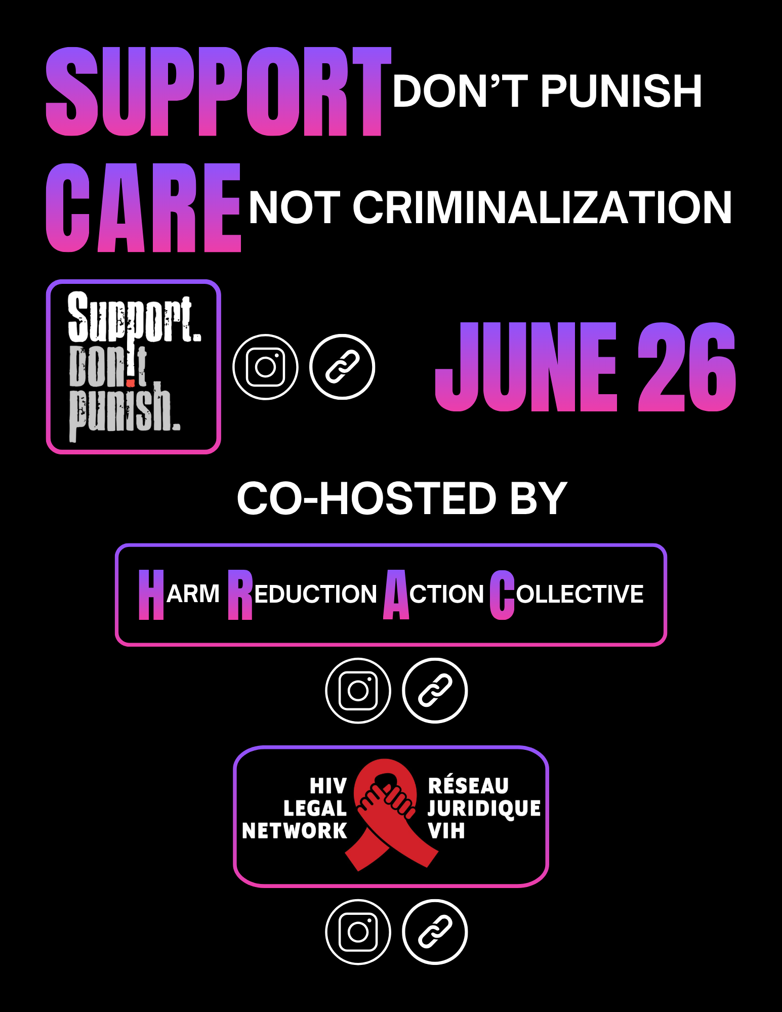 In collaboration with harm reduction groups and allied organizations from across the country, the Harm Reduction Action Collective (HRAC) and HIV Legal Network hosted a national virtual event on June 26th, 2025 – marking the Global Day of Action as part of the international Support. Don’t Punish campaign. The Global Day of Action is a moment of transnational solidarity – bringing us together to oppose stigma and injustice, while fostering change in laws, policies, and practices that undermine our communities’ wellbeing.